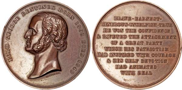 Reformer's bare head left, rev. 10-line tribute to statesman, supporter of the Reform Bill and relief of Jewish disabilities, founder of Protectionist Party. 51.5mm. 70.89gm. (BHM 2301, E 2107). Bronzed, good Extremely Fine apart from two very minor edge scrapes.