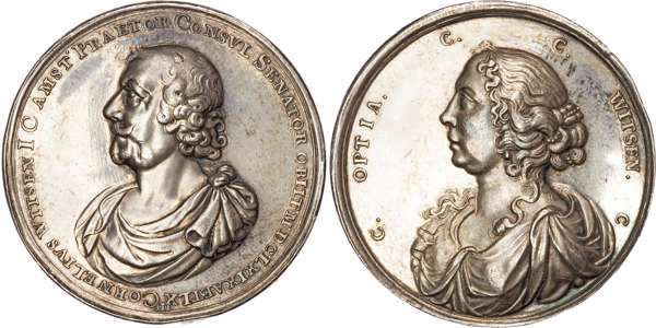 Silver medal 1669. His bust to the left. rev. Draped bust of his wife Cornelia Optia to the left. 59mm., 75.23gm. (Van Loon. III 71/65.1. About Extremely Fine but fields tooled in antiquity lightly toned, also a little buckled.