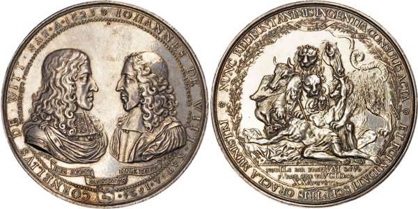 Facing draped busts, IOHANNES DE WITT. NAT. A. 1625 – CORNELIVS DE WITT. NAT. A. 1623. Scroll below: HIC ARMIS MAXIMVS ILLE TOGA, rev. The corpses of the two brothers shredded to pieces by a monster representing the furious mob of people, NUNC REDEUNTANIMIS INGENTIA CONSULIS ACTA ET FORMIDATI SCEPTRIS ORACLA MINISTRI; in exergue NOBILE PAR FRATERVM SAEVO FVROR ORE TRVCIDAT. XX AVCVSTI. Plain edge. 72mm., 108.33gm. (Van Loon-III-87.1 (French ed. 81.1), Saunders/Vanhoudt 1672.41). About Extremely Fine but fields tooled and cleaned in antiquity.