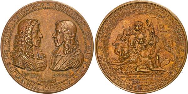 Facing draped busts, IOHANNES DE WITT. NAT. A. 1625 – CORNELIVS DE WITT. NAT. A. 1623. Scroll below: HIC ARMIS MAXIMVS ILLE TOGA, rev. The corpses of the two brothers shredded to pieces by a monster representing the furious mob of people, NUNC REDEUNTANIMIS INGENTIA CONSULIS ACTA ET FORMIDATI SCEPTRIS ORACLA MINISTRI; in exergue NOBILE PAR FRATERVM SAEVO FVROR ORE TRVCIDAT. XX AVCVSTI. Plain edge. 71mm., 90.31gm. (Van Loon-III-87.1 (French ed. 81.1), Saunders/Vanhoudt 1672.41). About Extremely Fine, toned.