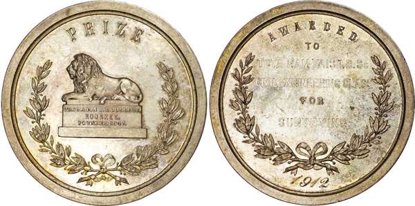 Awarded (engraved on rev.) to Tota Ram Vaish Civil Engineering Class 1912 for Surveying. British lion rests on inscribed plinth within open wreath PRIZE above, rev. Engraved award details within an olive wreath, 55.5mm., 80.18gm. Sterling. Good Extremely Fine toning but with original lustre.