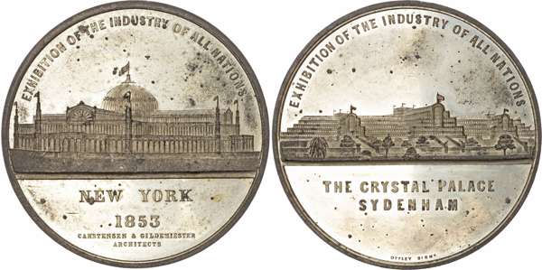 View of the New York Crystal Palace, rev. View of the Sydenham Crystal Palace, 74mm., 157.48gm. (rev. as obv. of Allen 1854/055 and see note). Some spotting, otherwise good Extremely Fine with full original lustre, very rare.