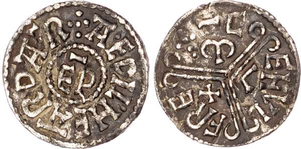 Canterbury mint. +AEDILHEARD A-R, EP within beaded circle, bar above, Rev. -COEHVVLF REX M, with Mercian M, voided tribach, 1.36g/6h. (BMC XXIV; N. 233; S. 886). About Very Fine, flan slightly crimped, but intact with no loss. Rare.