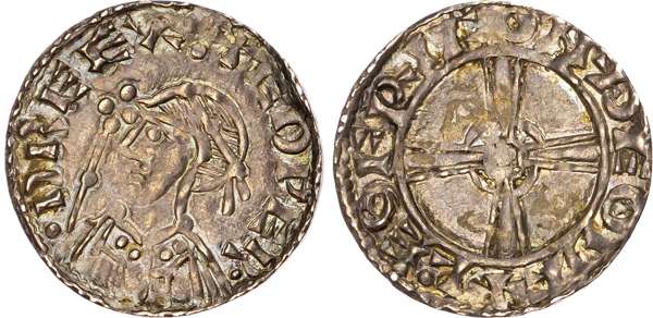 + EDPER D REX, diademed bust left, sceptre in front, Rev. LEOFRIC ON ĐEODF, expanding voided cross united by twin circles in centre, 1.62g/12h. (BMC V; Hild E; N. 823; S. 1177). Good Very Fine, attractive light blue toning.