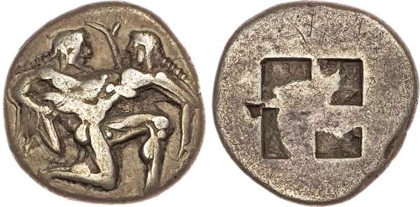 Ithyphallic satyr advancing right, carrying off protesting nymph. Rev. Quadripartite incuse square. (Le Rider, Thasiennes, 2; SNG Copenhagen 1008-9; HGC 6, 331). Good Very Fine.