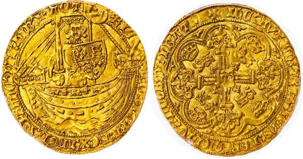King standing in ship with upright sword and quartered shield, voided short cross potent over cross fleurée. Rev. R at centre within Floriate cross with R in central quadrilobe, trefoils in spandrels. (North 1304; SCBC 1655). Good extremely fine. Encapsulated by PCGS as MS63.