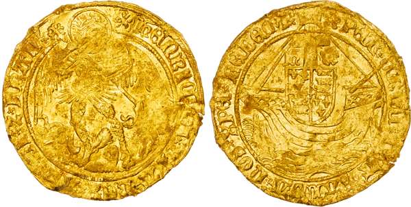St. Michael in armour, slaying the dragon, Rev. Ship surmounted by Royal Arms, mast dividing H and rose, 4.98g/4h. (N. 1696; S. 2183). Good Very Fine, some weak areas. Crinkled flan indicative of a field find, small break at 3/4h, but some traces of mint lustre.