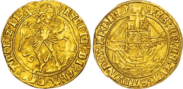 The angel Michael slaying the dragon, crooked-shaped abbreviation after King’s name in legend, Rev. Ship surmounted by Royal Arms, mast dividing ‘h’ and rose, 5.01g/5h. (N. 1698; S. 2187). Good Very Fine to near Extremely Fine, a pleasing portrait.