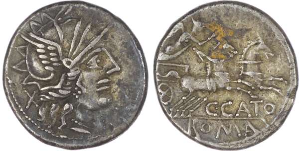 C. Porcius Cato (123 BC) AR Denarius, Rome, 3.66g. Helmeted head of Roma facing right, X (mark of value) behind. Rev. Victory, holding reins and whip, driving biga right, C•CATO below, ROMA below. (Crawford 274/1; Sydenham 417). Good Very Fine. Some deposits to the reverse.