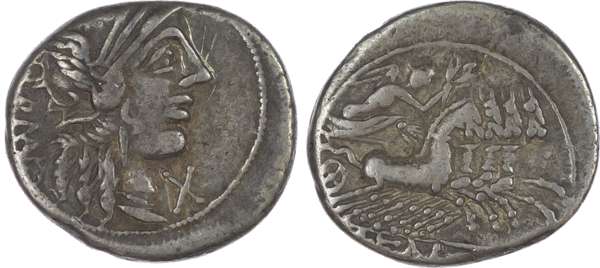 M. Fannius C. f. (123 BC) AR Denarius, Rome, 3.83g. ROMA, helmeted head of Roma facing right, X (mark of value) behind. Rev.