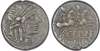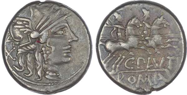 C. Plutius (121 BC) AR Denarius, Rome, 3.91g. Helmeted head of Roma facing right, X (mark of value) behind. Rev. The