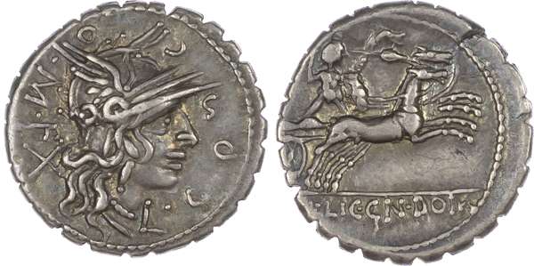 L. Cosconius M. f. (118 BC) AR Denarius Serratus, Narbo, 3.95g. L•COS-C-O•M•F, helmeted head of Roma facing right, X (mark