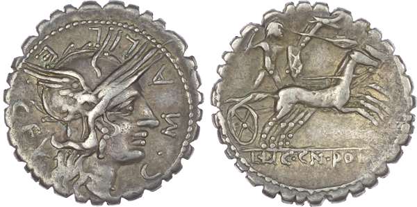 C. Malleolus C. f. (118 BC) AR Denarius Serratus, Narbo, 3.95g. C•MALLE•C•F, helmeted head of Roma facing right, X (mark of