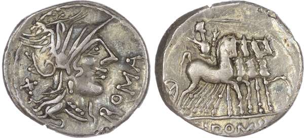 Cn. Domitius Ahenobarbus (116-115 BC) AR Denarius, Rome, 3.87g. ROMA, helmeted head of Roma facing right, mark of value behind. Rev. Jupiter, holding branch and thunderbolt, driving quadriga right, [CN•DOMI] in exergue. (Crawford 285/1; Sydenham 535). Good Very Fine. Scratches to reverse field.