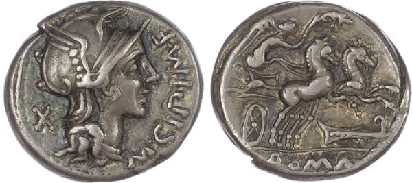 M. Cipius (115-114 BC) AR Denarius, Rome, 3.90g. M•CIPI•M•F, helmeted head of Roma facing right, X (mark of value) behind.