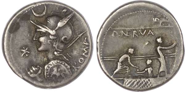 P. Licinius Nerva (113-112 BC) AR Denarius, Rome, 3.92g. ROMA, helmeted bust of Roma facing left, holding spear over