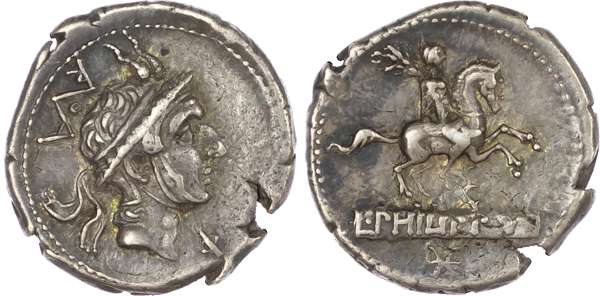 L. Philippus (113-112 BC) AR Denarius, Rome, 3.94g. Head of Philip V of Macedon facing right, wearing a royal Macedonian helmet decorated with goat horns, ROMA (in monogram form) behind. Rev. Equestrian statue, holding branch, set on platform inscribed PHILIPPVS, mark of value below. (Crawford 293/1; Sydenham 551). Good Very Fine. A few striking splits in the flan, otherwise a pleasing example with toned lustre, struck on a large flan.