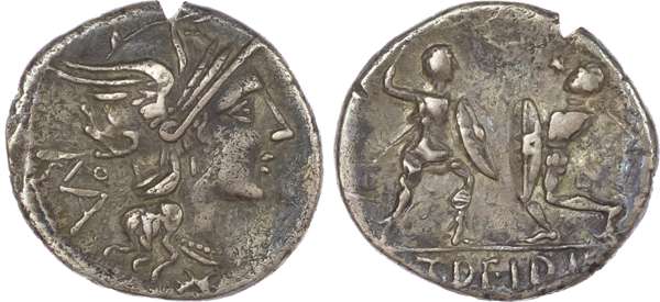 T. Didius (113-112 BC) AR Denarius, Rome, 2.92g. Helmeted head of Roma facing right, ROMA (in monogram form) behind. Rev. Two gladiators fighting, each holding shield, the left wielding a flail and the right a sword, T•DEIDI in exergue. (Crawford 294/1; Sydenham 550). Very Fine. Some porosity.