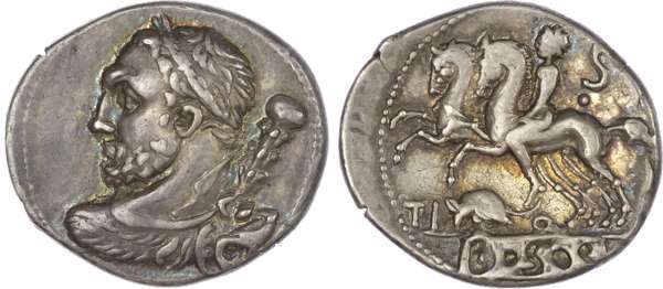 T. Quinctius (112 or 111 BC) AR Denarius, Rome, 3.95g. Bust of Hercules seen from behind, draped with lionskin and with a club over his right shoulder. Rev. Desultor on horseback left, S behind, rat below, D S S in incuse, on tablet below. (Crawford 297.1a; Sydenham 563). Extremely Fine. A super piece, well centred on both sides. Delicate grey/blue toning with lustrous flashes in places.