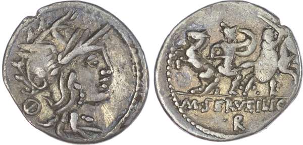 M. Servilius C. f. (100 BC) AR Denarius, Rome, 3.84g. Helmeted head of Roma facing right, O behind. Rev. Roman and barbarian