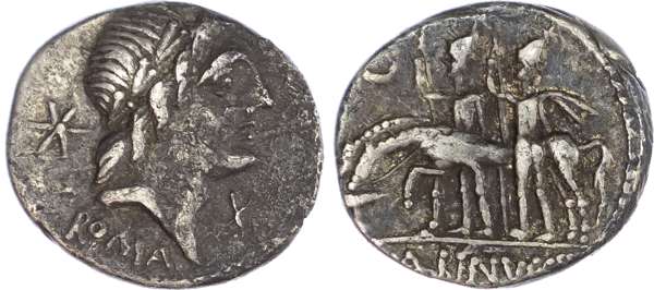 C. Malleolus, A. Albinus Sp. f. and L. Caecilius Metellus (96 BC) AR Denarius, Rome, 3.75g. Laureate head of Apollo facing