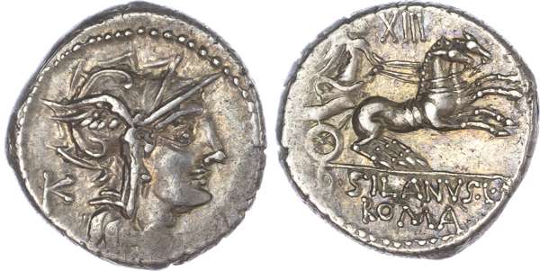 D. Silanus L. f. (91 BC) AR Denarius, Rome, 4.02g. Helmeted head of Roma facing right, K behind. Rev. Victory, holding reins, driving biga right, XIII above, D•SILANVS•L•F / ROMA in exergue. (Crawford 337/3; Sydenham 646). Good Very Fine. Some golden toning.