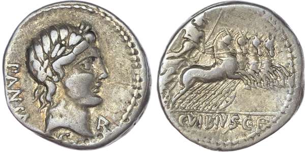 C. Vibius C. f. Pansa (90 BC) AR Denarius, Rome, 3.84g. PANSA, laureate head of Apollo facing right, symbol below chin. Rev.