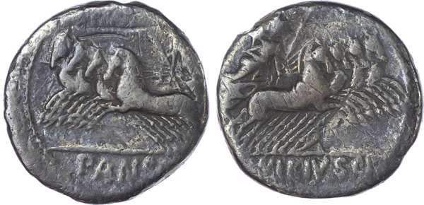 C. Vibius C. f. Pansa (90 BC) AR Denarius, Rome, 3.16g. Minerva, holding spear and trophy, driving quadriga right, PANSA in exergue. Rev. Minerva, holding spear and trophy, driving quadriga left, C•VIBIVS•C•F. (Crawford 342/6a; Sydenham 687). About Fine.