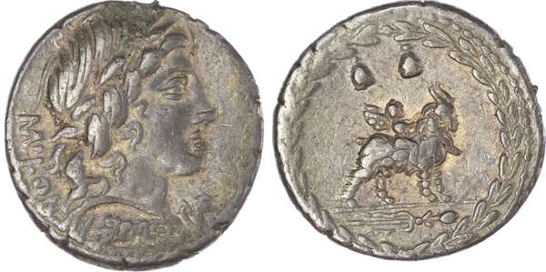 Mn. Fonteius (85 BC) AR Denarius, Rome, 3.75g. M•FONTEI•C•F, laureate head of Apollo facing right. Rev. Infant Genius (or Cupid) seated on goat standing right, pilei of the Dioscuri above, thyrsus with fillet in exergue, all within a laurel wreath. (Crawford 353/1c; Sydenham 724a). Good Very Fine.