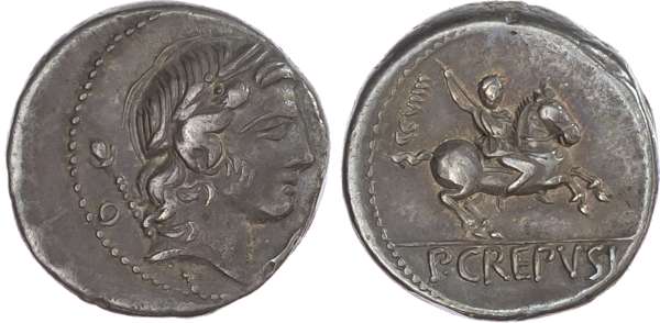 P. Crepusius (82 BC) AR Denarius, Rome, 3.90g. Laureate head of Apollo facing right, sceptre behind. Rev. Horseman galloping