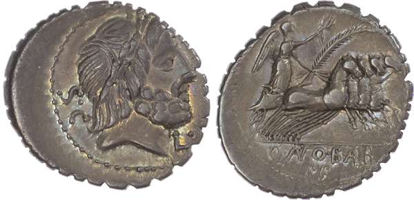 Q. Antonius Balbus (83-82 BC) AR Denarius, Rome, 3.84g. Laureate head of Jupiter facing right, S•C behind, control mark below chin. Rev. Victory, holding reins, palm and wreath, driving quadriga right, Q•ANTO•BALB / P•R. (Crawford 364/1c; Sydenham 742a). Nearly Extremely Fine. Off‑centre on obverse. Attractive tone.