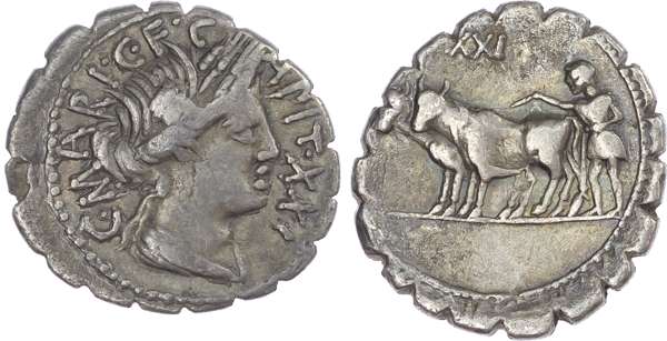 C. Marius C. f. Capito (81 BC) AR Denarii Serrate (2), Rome, 3.75g and 3.74g. C•MARI•C•F •CAPIT•XXI (and XXVIIII), draped bust of Ceres facing right, wearing a wreath of grain ears. Rev. Ploughman with yoke of oxen left, XVIIII above and S•C in exergue, (other XXI above). (Crawford 378/1a; Sydenham 744a). Both coins Very Fine. One with scratches to reverse.