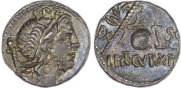 Cn. Cornelius Lentulus (76-75 BC) AR Denarius, uncertain Spanish mint, 3.92g. G•P•R, diademed draped bust of the Genius of the Roman People facing right, sceptre behind. Rev. EX• – S•C / CN•LEN•Q, wreathed sceptre, globe and rudder. (Crawford 393/1a; Sydenham 752). Extremely Fine. Beautiful toning. Minor scratch on neck.