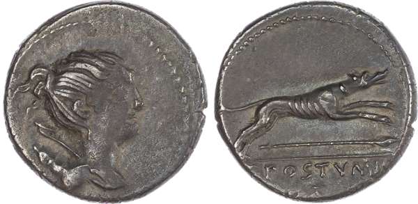 C. Postumius (73 BC) AR Denarius, Rome, 3.81g. Draped bust of Diana facing right, bow and quiver over shoulder. Rev. Hound