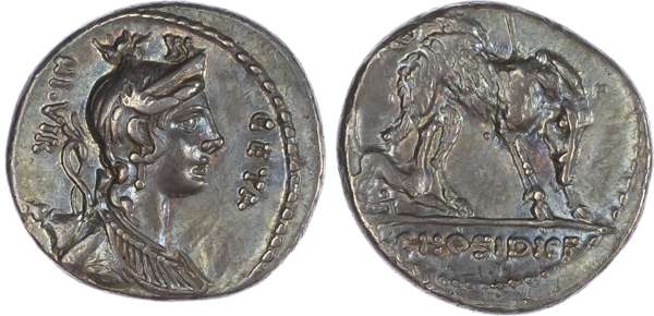 C. Hostidius C. f. Geta (68 BC) AR Denarius, Rome, 4.04g. GETA – III•VIR, draped bust of Diana facing right. Rev. Calydonian Boar left, with spear protruding from back, hound below, C•HOSTIDI•C•F in exergue. (Crawford 407/2; Sydenham 903). Extremely Fine. Pleasing blue/grey toning. Struck in high relief. A spectacular example.