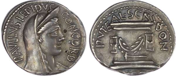 L. Aemilius Lepidus Paullus and L. Scribonius Libo (62 BC) AR Denarius, Rome, 3.78g. PAVLLVS LEPIDVS CONCORDIA, draped head of Concordia facing right. Rev. PVTEAL SCRIBON – LIBO, the Scribonian Well decorated with garland and two lyres, hammer at base. (Crawford 417/1a; Sydenham 927). About Extremely Fine. Test mark to obverse field.