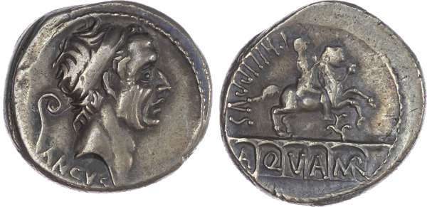 L. Marcius Philippus (57 BC) AR Denarius, Rome, 4.21g. ANCVS, diademed head of Ancus Marcius facing right, lituus behind. Rev. PHILIPPVS, equestrian statue right, atop aqueduct, A-Q-V-A MAR within arches. (Crawford 425/1; Sydenham 919). Good Very Fine. Pleasing tone.