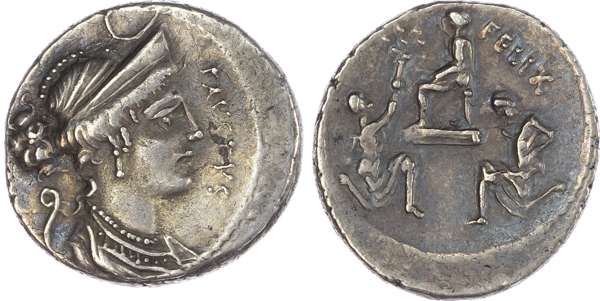 Faustus Cornelius Sulla (56 BC) AR Denarius, mint of Rome, 3.96g. FAVSTVS, draped bust of Diana facing right, wearing stephane, lituus behind. Rev. FELIX, Sulla, togate, seated left on throne, Bocchus (to left), kneeling and offering an olive branch, Jugurtha (right) kneeling, hands bound. (Crawford 426/1; Sydenham 879). Extremely Fine. Well centred with reverse details clearly visible.