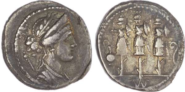 Faustus Cornelius Sulla (56 BC) AR Denarius, mint of Rome, 3.73g. Draped bust of Venus facing right, sceptre behind. Rev. Three military trophies, lituus to right, capis to left, FAVSTVS monogram in exergue. (Crawford 426/3; Sydenham 884). About Good Very Fine.