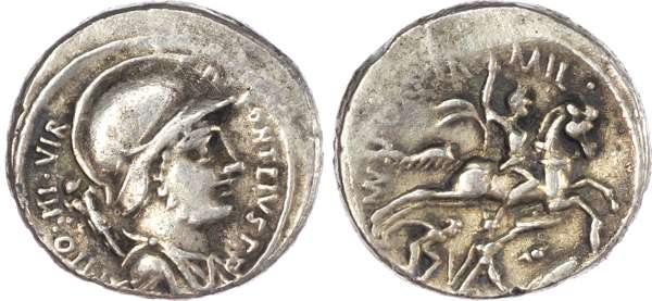 P. Fonteius P. f. Capito (55 BC) AR Denarius, mint of Rome, 2.65g. P•FONTEIVS•CAPITO•III •VIR, helmeted and draped bust of Mars facing right, trophy over shoulder. Rev. MN•FONT•TR•MIL, warrior on horseback right, thrusting spear at fallen enemy below, unarmed captive to left. (Crawford 429/1; Sydenham 900). Good Fine. Edge marks.