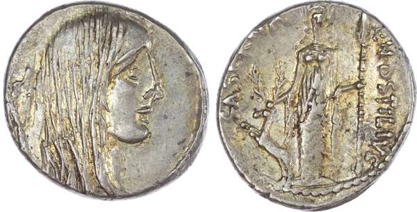 L. Hostilius Saserna (48 BC) AR Denarius, Rome, 4.06g. Bare head of Gallia facing right, carnyx behind. Rev. HOSTILIVS - SASERNA, Diana (Artemis) of Ephesus standing facing, holding spear, stag leaping left. (Crawford 448/3; Sydenham 953). Extremely Fine. Lustrous.