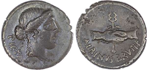 Albinus Bruti f. (48 BC) AR Denarius, Rome, 3.48g. PIETAS, head of Pietas facing right. Rev. ALBINVS•BRVTI•F, clasped hands with caduceus. (Crawford 450/2; Sydenham 942). Fine. Dark toning and pitted surfaces.