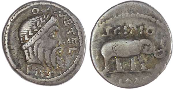 Q. Caecilius Metellus Pius Scipio (46 BC) AR Denarius, moving mint with Scipio in Africa, 3.89g. Q•METEL•PIVS, laureate head of Jupiter facing right. Rev. SCIPIO•IMP, elephant right. (Crawford 459/1; Sydenham 1046). Good Fine. Banker’s mark to elephant.
