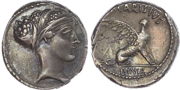 T. Carisius (46 BC) AR Denarius, Rome, 4.07g. Head of the Sibyl Herophile facing right. Rev. T•CARISIVS, sphinx seated