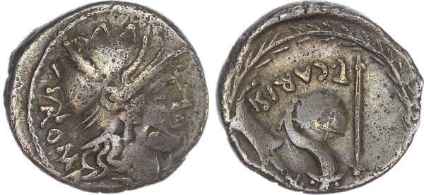T. Carisius (46 BC) AR Denarius, Rome, 3.60g. ROMA, helmeted head of Roma facing right. Rev. T•CARISI, sceptre, cornucopiae, globe and rudder, all within a wreath. (Crawford 464/3c; Sydenham 984a). Very Fine. Banker’s mark.