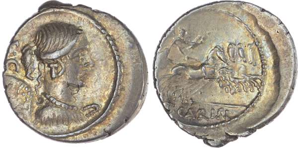 T. Carisius (46 BC) AR Denarius, Rome, 3.54g. Winged and draped bust of Victory facing right, SC behind. Rev. Victory, holding reins and wreath, driving quadriga right, T•CARISI in exergue. (Crawford 464/5; Sydenham 985). Good Very Fine. Toned lustre.