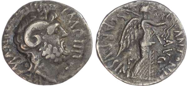 Mark Antony and L. Pinarius Scarpus (31 BC) AR Denarius, Cyrene, 3.65g. M•ANTO•COS•III•IMP•IIII, head of Jupiter Ammon facing right. Rev. ANTONIO – SCARPVS IMP, Victory advancing right, holding wreath and palm. (Crawford 546/2a; Sydenham 1280). Very Fine.