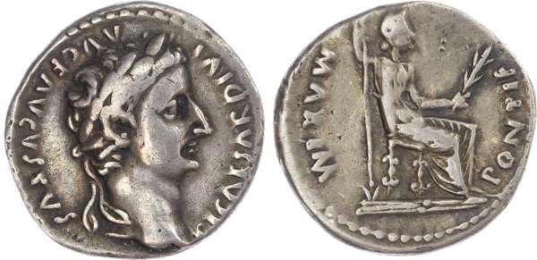 Tiberius (AD 14-37) AR Denarius, Lugdunum, c. AD 15-18, 3.72g. TI CAESAR DIVI AVG F AVGVSTVS, laureate head of Tiberius facing right. Rev. PONTIF MAXIM, Livia, as Pax, holding sceptre and branch, seated left on throne with ornate legs. (RIC 30; RSC 16a). Very Fine. Pleasing cabinet tone. Some peck marks.
