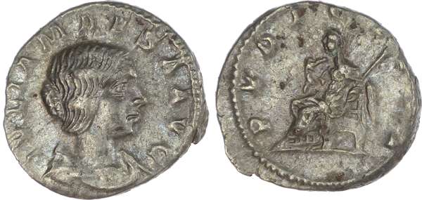 Julia Maesa (AD 218-222) AR Denarius, Rome, 3.01g. IVLIA MAESA AVG, draped bust of Julia Maesa facing right. Rev. PVDICITIA, Pudicitia seated left, holding sceptre. (RIC 268; RSC 36). Good Very Fine.
