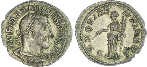 Maximinus Thrax (AD 235-238) AR Denarius, mint of Rome, AD 236-238, 3.29g. MAXIMINVS PIVS AVG, laureate and draped bust of Maximinus Thrax facing right. Rev. PROVIDENTIA AVG, Providentia standing left, holding cornucopiae and wand, globe to left. (RIC 20; RSC 75). Good Very Fine.
